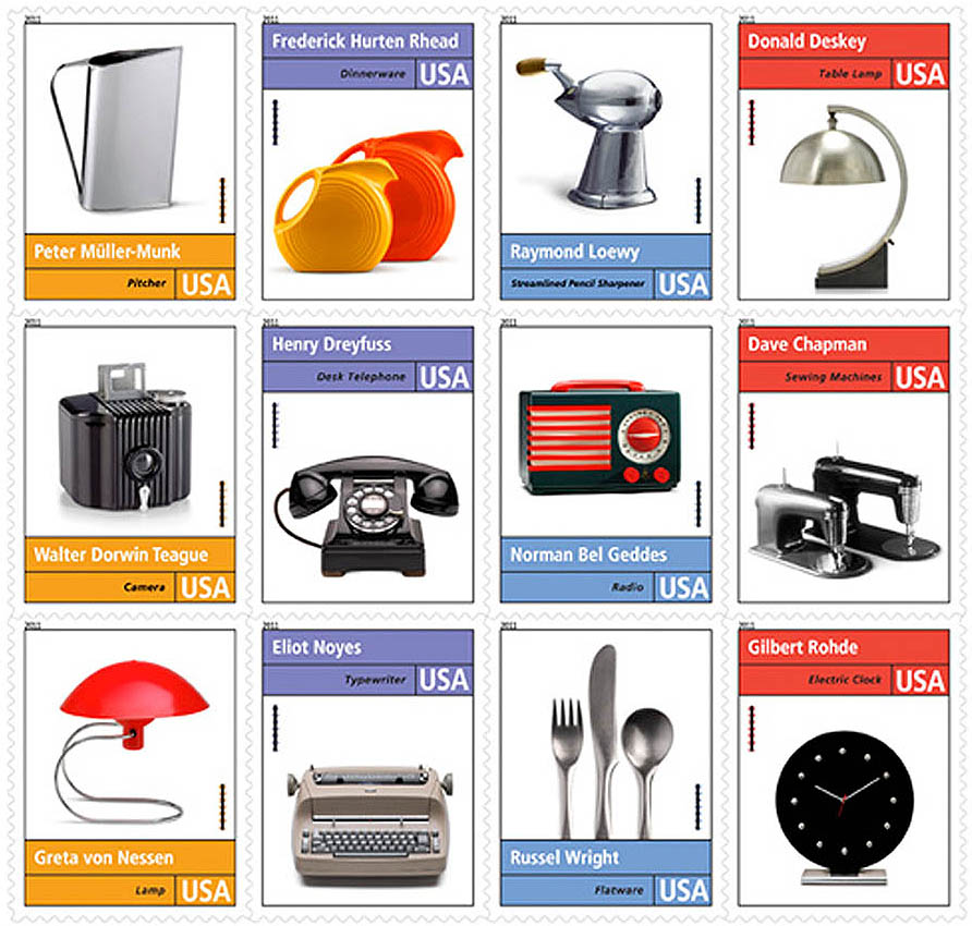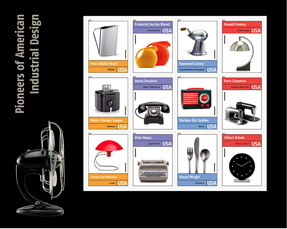 The Pioneers of American Industrial Design (Forever®) stamp sheet honors 12 of the nation's most important and influential industrial designers: Peter-Muller Munck, Frederick Hurton Rhead, Raymond Leowy, Donald Deskey, Walter Dorwin Teague, Henry Dreyfuss, Norman Bel Geddes, Dave Chapman, Greta von Nessen, Elliot Noyes, Russel Wright and Gilbert Rhode.